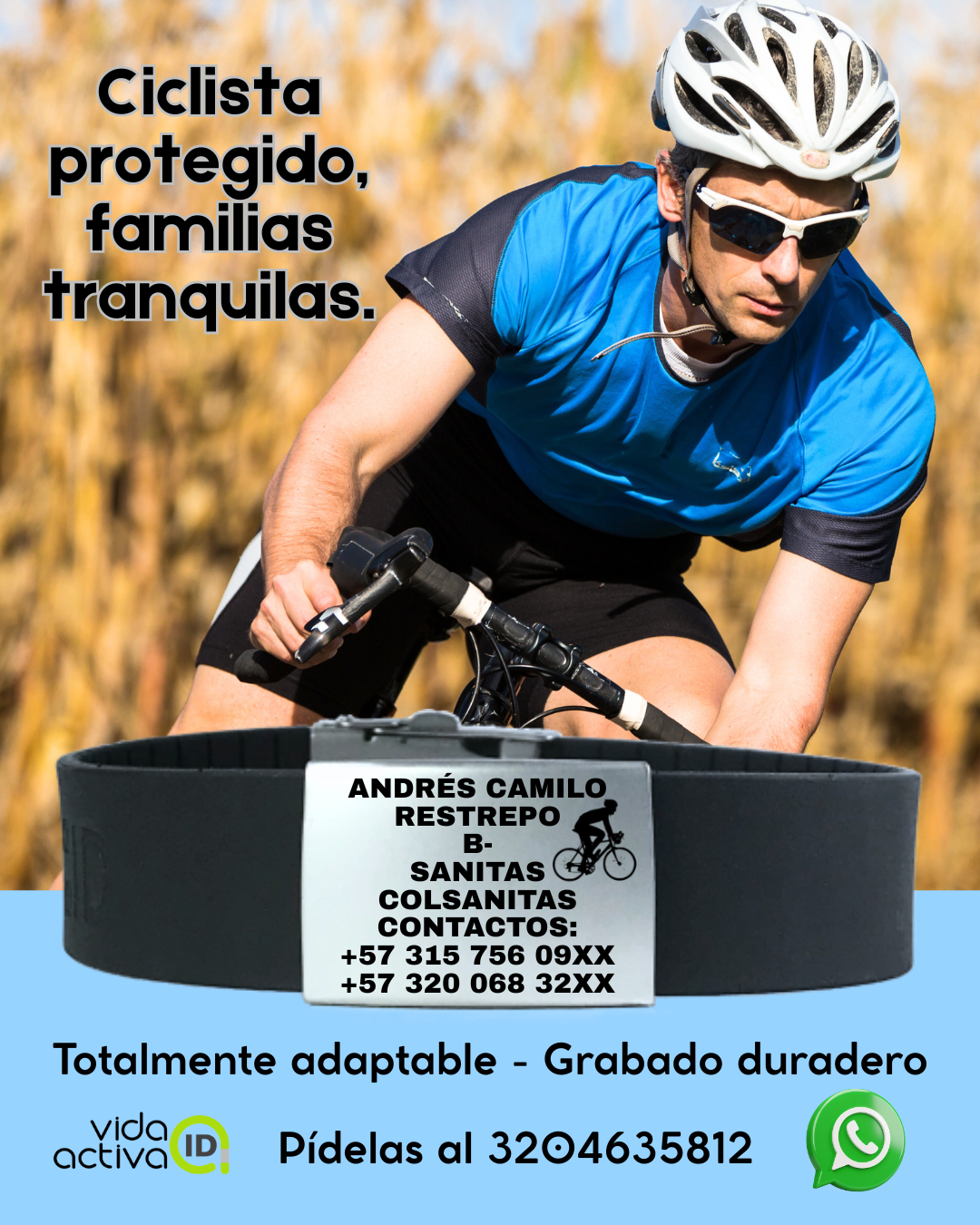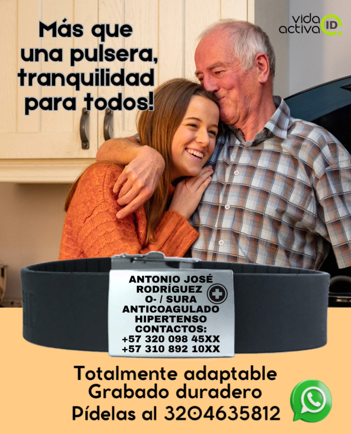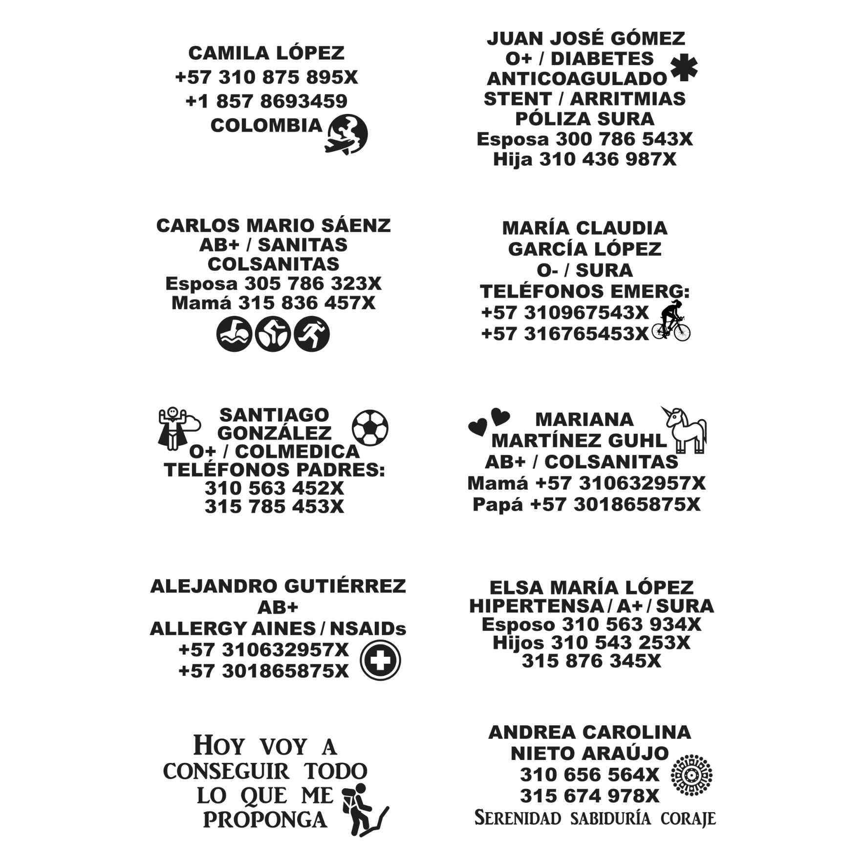 Además, te da la tranquilidad a ti y a tu familia de proveerle al personal de ayuda información importante en un momento de emergencia, si tú o tu ser querido no pueden hacerlo. En la placa grabamos tu información contacto y/o de salud como: nombres, teléfonos de contacto, si es el caso, una condición de salud importante, la EPS o Prepagada que te atiende. ¡También podemos grabar un ícono o una frase que te guste! Mira las opciones de íconos en las imágenes de este modelo.